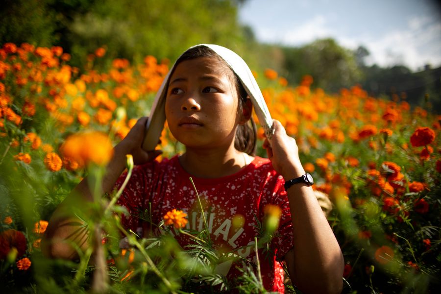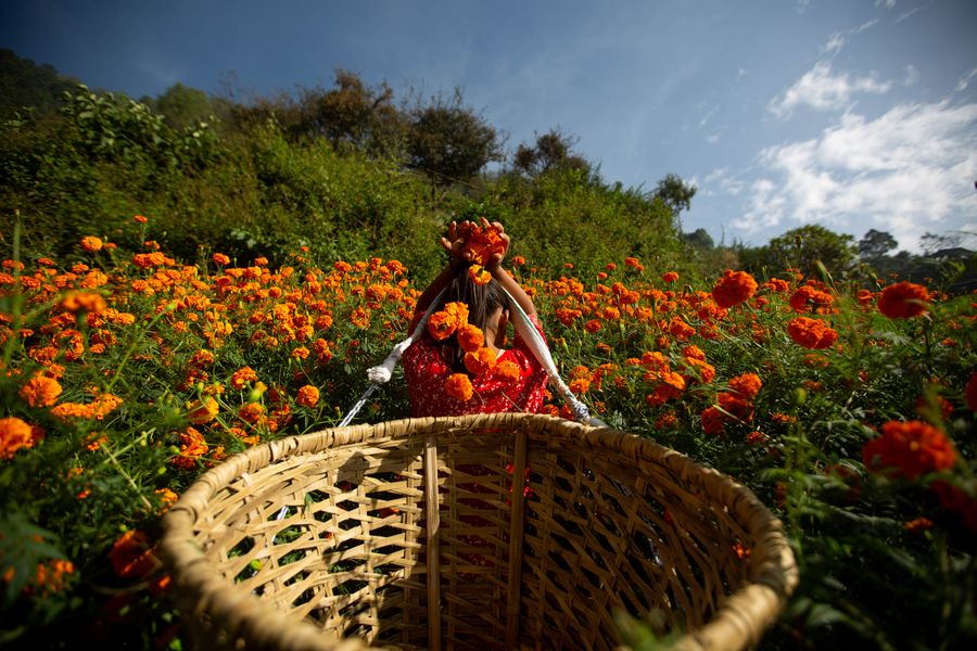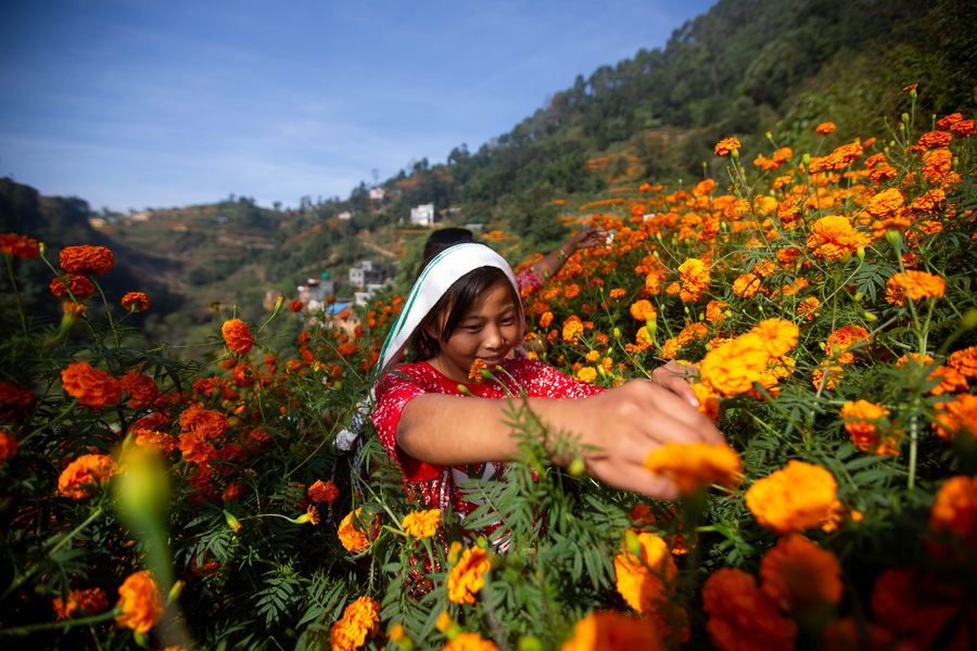 A Nepalese girl collects marigold flowers for the upcoming Tihar, the Hindu festival of lights, in Kathmandu, Nepal, Oct. 24, 2019. (Photo by Sulav Shrestha/Xinhua)