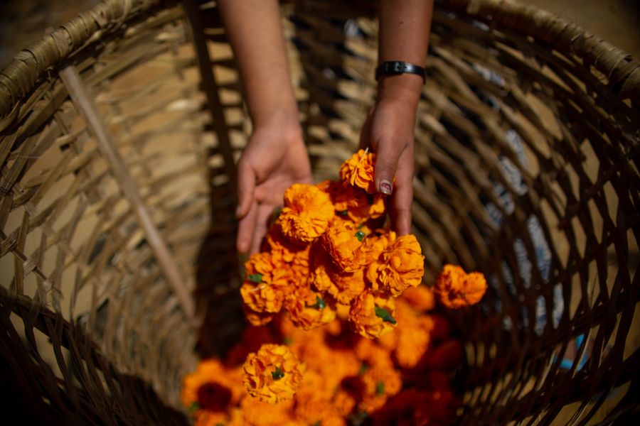 A Nepalese girl collects marigold flowers for the upcoming Tihar Festival in Kathmandu, Nepal, on Oct. 24, 2019. (Photo by Sulav Shrestha/Xinhua)