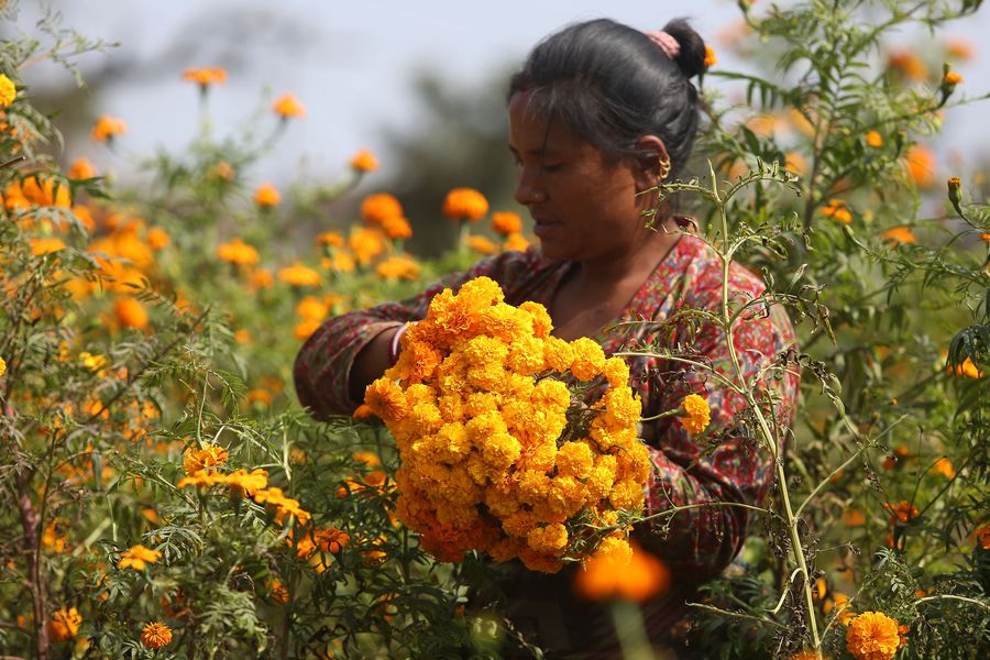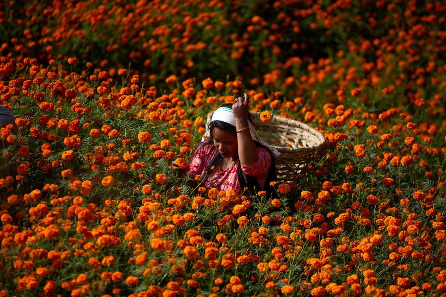 A Nepalese woman collects marigold flowers for offerings and garlands for Tihar festival at a flower farm in Kathmandu, Nepal, Oct. 24, 2019. (Photo by Sunil Sharma/Xinhua)