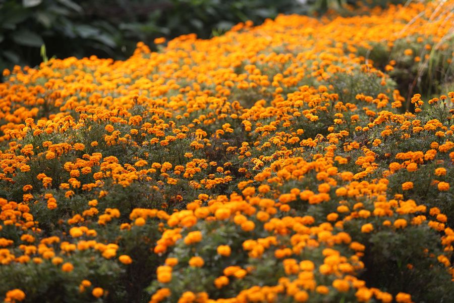 Blooming marigold flowers are seen at a flower farm in Kathmandu, Nepal, Oct. 24, 2019. (Photo by Sunil Sharma/Xinhua)