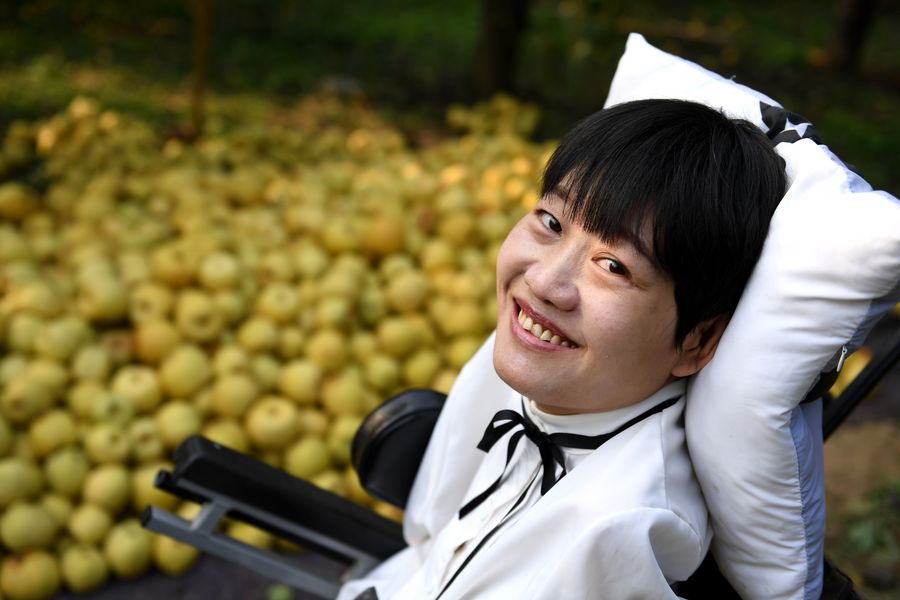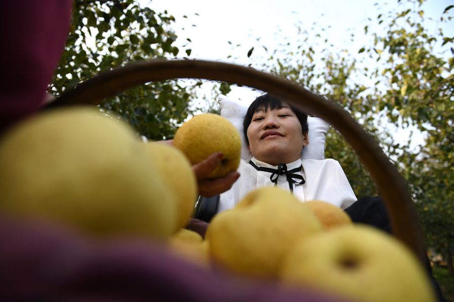 Li Juan sits in her family's pear orchard in Tangzhai Village of Tangzhai Town in Dangshan County, Oct. 23, 2019. (Xinhua/Zhang Duan)