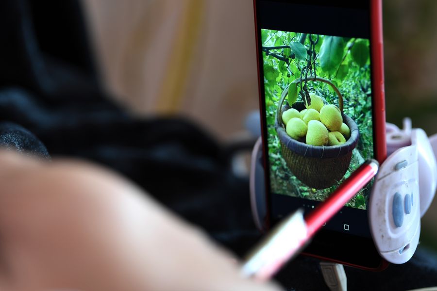 Li Juan posts photos of pears on the Internet in Tangzhai Village of Tangzhai Town in Dangshan County, Oct. 23, 2019. (Xinhua/Liu Junxi)