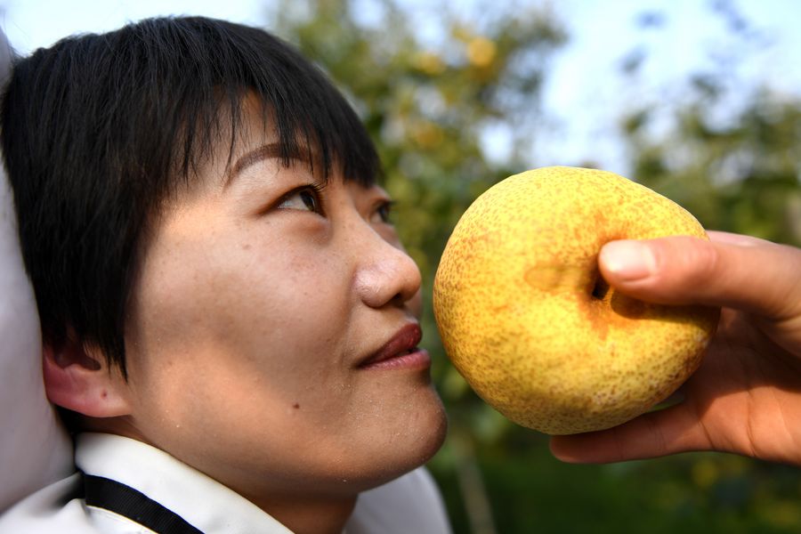 Li Juan smells a newly-picked pear in her family's pear orchard in Tangzhai Village of Tangzhai Town in Dangshan County, Oct. 23, 2019. (Xinhua/Zhang Duan)