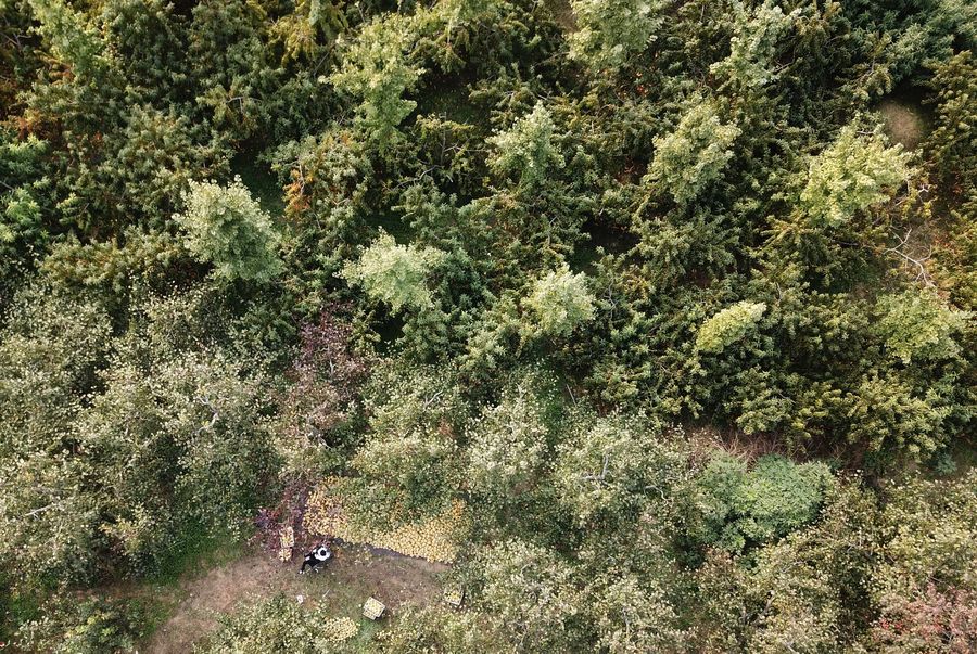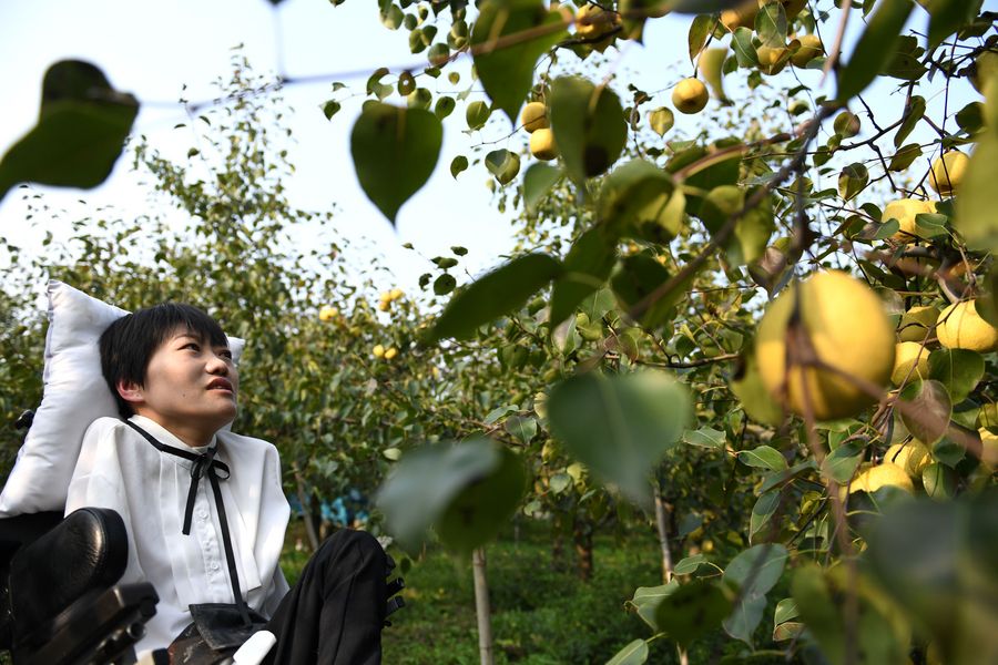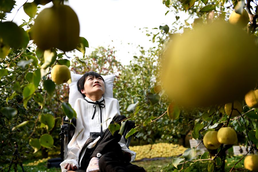 Li Juan sits in her family's pear orchard in Tangzhai Village of Tangzhai Town in Dangshan County, Oct. 23, 2019. (Xinhua/Liu Junxi)