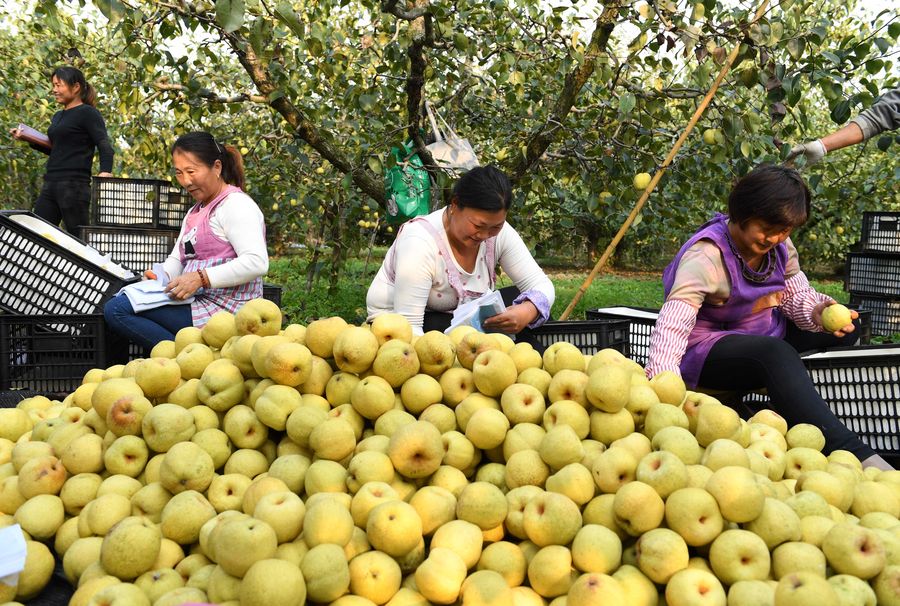 Villagers sort pears in Tangzhai Village of Tangzhai Town in Dangshan County, Oct. 23, 2019. (Xinhua/Zhang Duan)