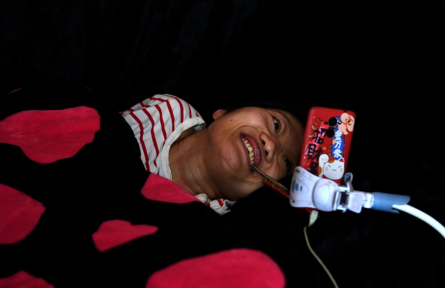 In 2015, Li Juan received a touch-screen phone by installing an Internet cable. Li quickly learned to surf the Internet by tying a stylus to her chopsticks with tape. Since then, fate has opened a glimmer of light to Li Juan. Her world is no longer a bed and a room. She surfs on the Internet, registering for QQ and WeChat, and typing with her mouth faster than most people do with their hands.