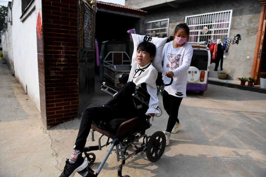 Li Xueru, the younger sister, pushes Li Juan out on a wheelchair in Tangzhai Village of Tangzhai Town in Dangshan County, Oct. 23, 2019. (Xinhua/Zhang Duan)
