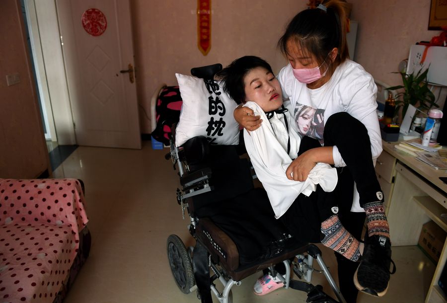 Li Xueru, the younger sister, holds Li Juan onto a wheelchair in Tangzhai Village of Tangzhai Town in Dangshan County, Oct. 23, 2019. (Xinhua/Zhang Duan)