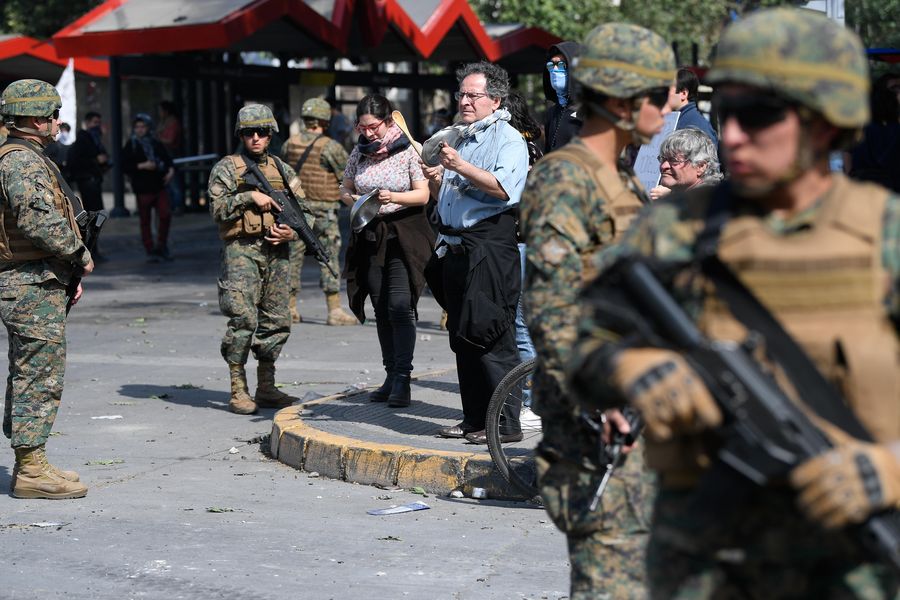 Soldiers stand guard on the street in Santiago, Chile, Oct. 19, 2019. (Xinhua/Jorge Villegas)