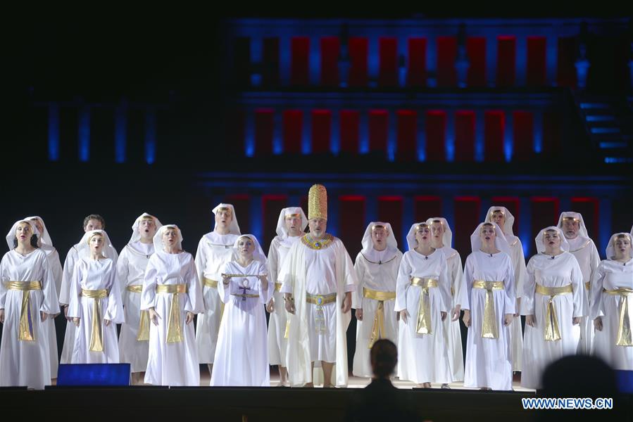 Artists perform Opera Aida in the Temple of Hatshepsut in Luxor, Egypt, on Oct. 26, 2019. Opera Aida was performed on Saturday in Luxor after a hiatus of over two decades. (Photo by Radwan/Xinhua)