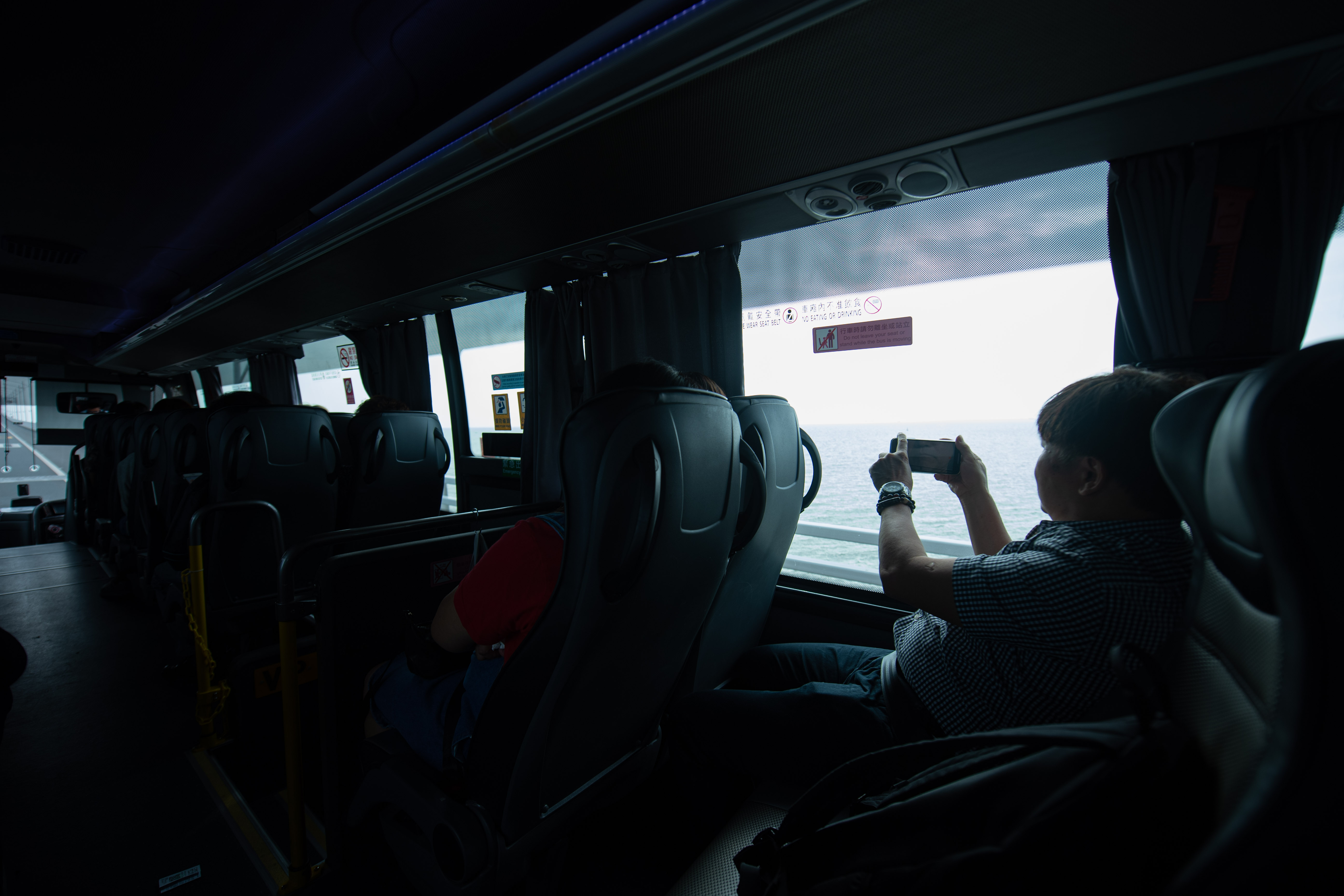 A tourist takes photos on a Hong Kong-Zhuhai-Macao Bridge shuttle bus heading for Hong Kong, south China, Oct. 24, 2019. (Xinhua/Cheong Kam Ka)