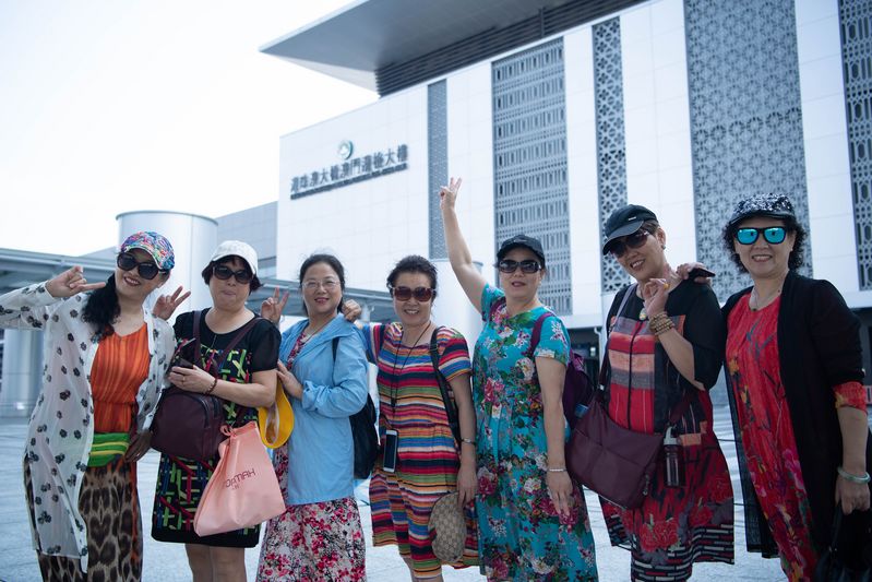 Tourists pose for photos in front of the Macao frontier inspection building of the Hong Kong-Zhuhai-Macao Bridge, in south China's Macao, Oct. 24, 2019. (Xinhua/Cheong Kam Ka)