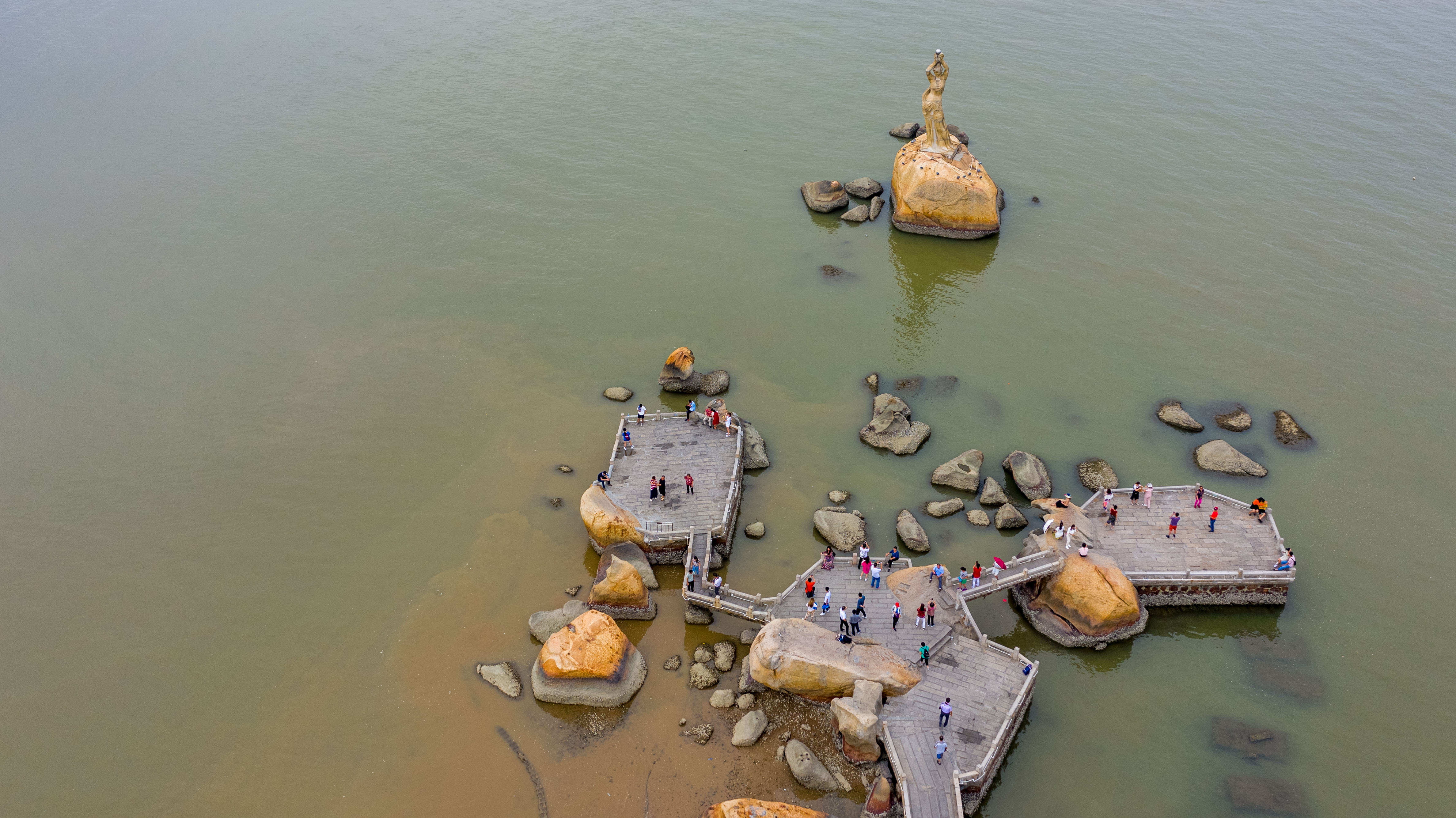 Aerial photo taken on Oct. 24, 2019 shows a view of the fishing girl statue, a landmark of Zhuhai City in Zhuhai, south China's Guangdong Province. (Xinhua/Cheong Kam Ka)
