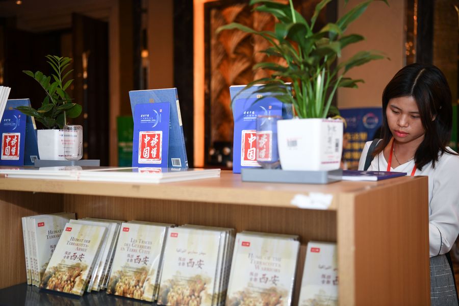 A participant reads books on display during the fourth Understanding China Conference in Guangzhou, capital of south China's Guangdong Province, Oct. 26, 2019. (Xinhua/Deng Hua)