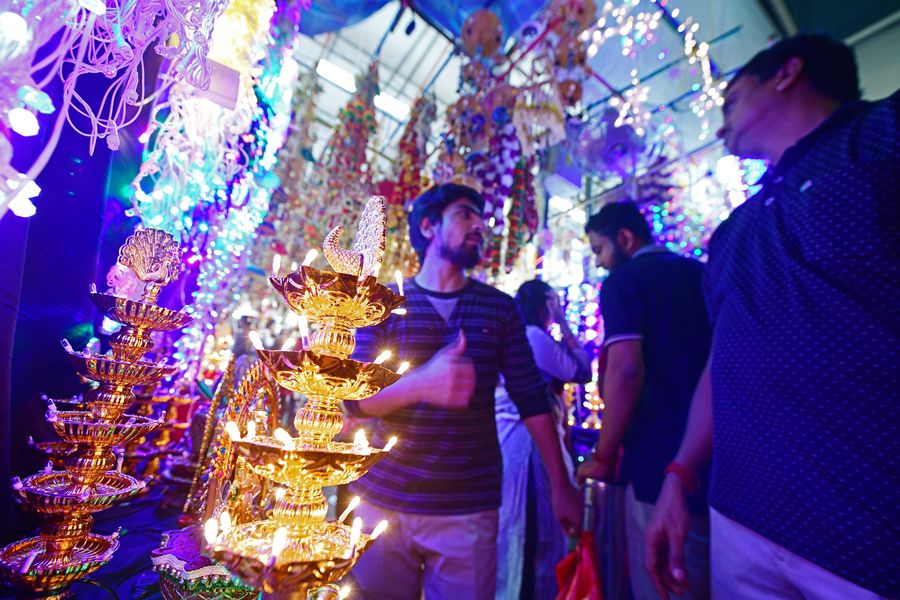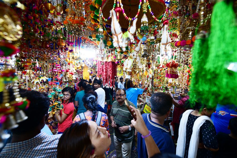 Customers shop for Deepavali Festival at a market in Singapore's Little India on Oct. 26, 2019. (Xinhua/Then Chih Wey)■