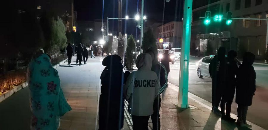 People take refuge in the streets of Xiahe County in the early morning of Oct. 28, after an earthquake. (Photo by Li Qi/Xinhua)