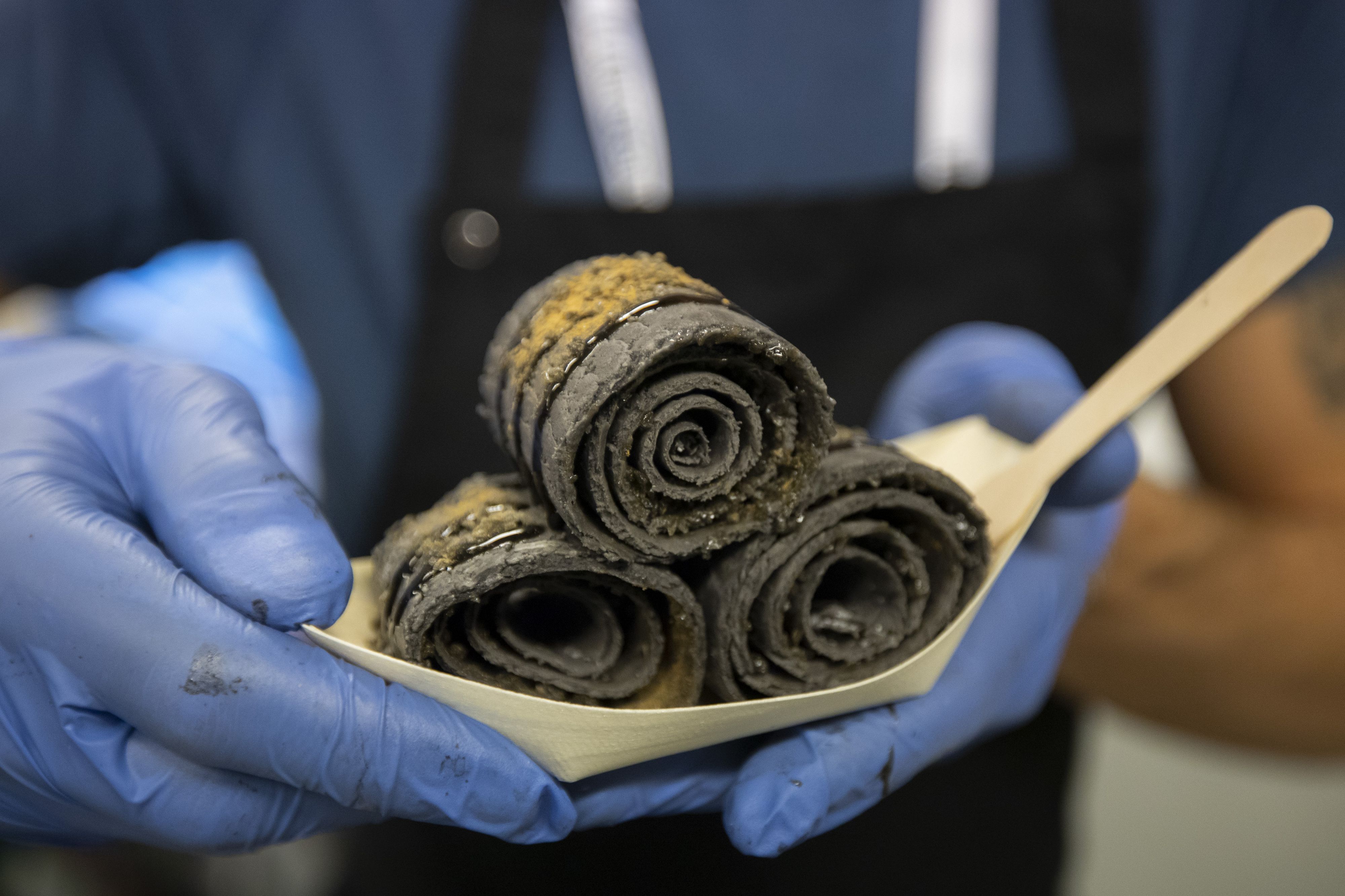 Licorice roll ice cream is made and served at the licorice festival in Helsinki, Finland, on Oct. 27, 2019. The licorice festival of this year featured new licorice flavor tasting, licorice cake decoration, licorice knowledge lecture, etc. (Photo by Matti Matikainen/Xinhua)