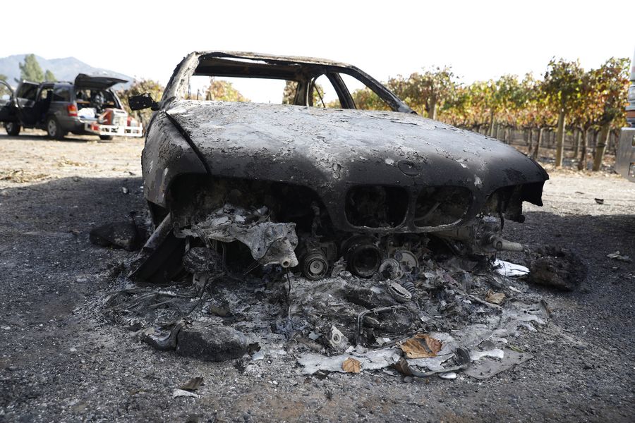 Photo taken on Oct. 24, 2019 shows a burnt car in Sonoma County, the U.S. state of California. (Photo by Li Jianguo/Xinhua)