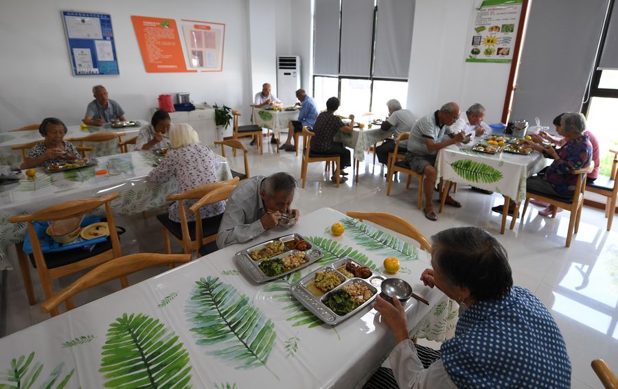Elderly villagers have a meal at an elderly care service center in Yonggong Village of Zhoushi Township in Kunshan City, east China's Jiangsu Province, Aug. 26, 2019. About 112 day-care service centers and meal service providers for the elderly have been in operation so far in the city. (Xinhua/Ji Chunpeng)