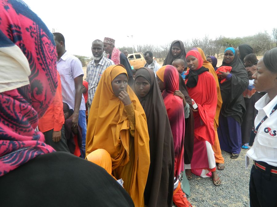 The photo shows Somali refugees queue for screening before boarding a plane back to their motherland at the Dadaab airstrip, northeastern Kenya, Nov. 2, 2015. (Xinhua/Stephen Ingati)
