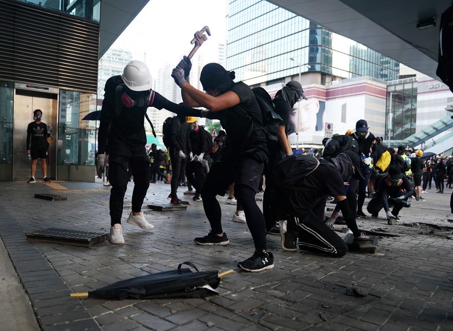 Rioters damage the road in Admiralty area of China's Hong Kong Special Administrative Region (HKSAR), Sept. 15, 2019. (Xinhua)