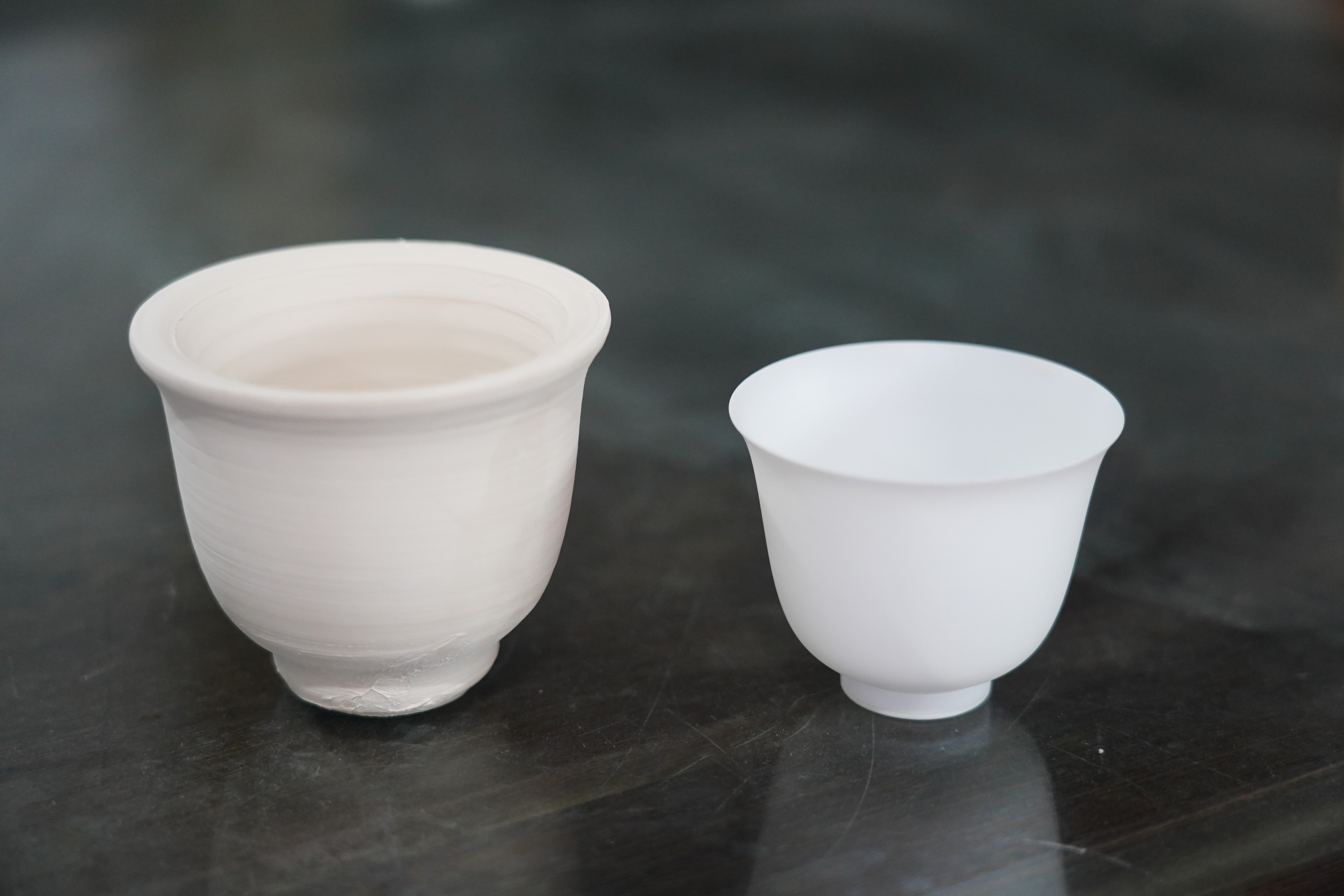 Photo taken on Oct. 28, 2019 in Jingdezhen, east China's Jiangxi Province, shows a finished thin body porcelain cup (R) is much thinner than the semi-finished one. (Xinhua/Zhou Mi)