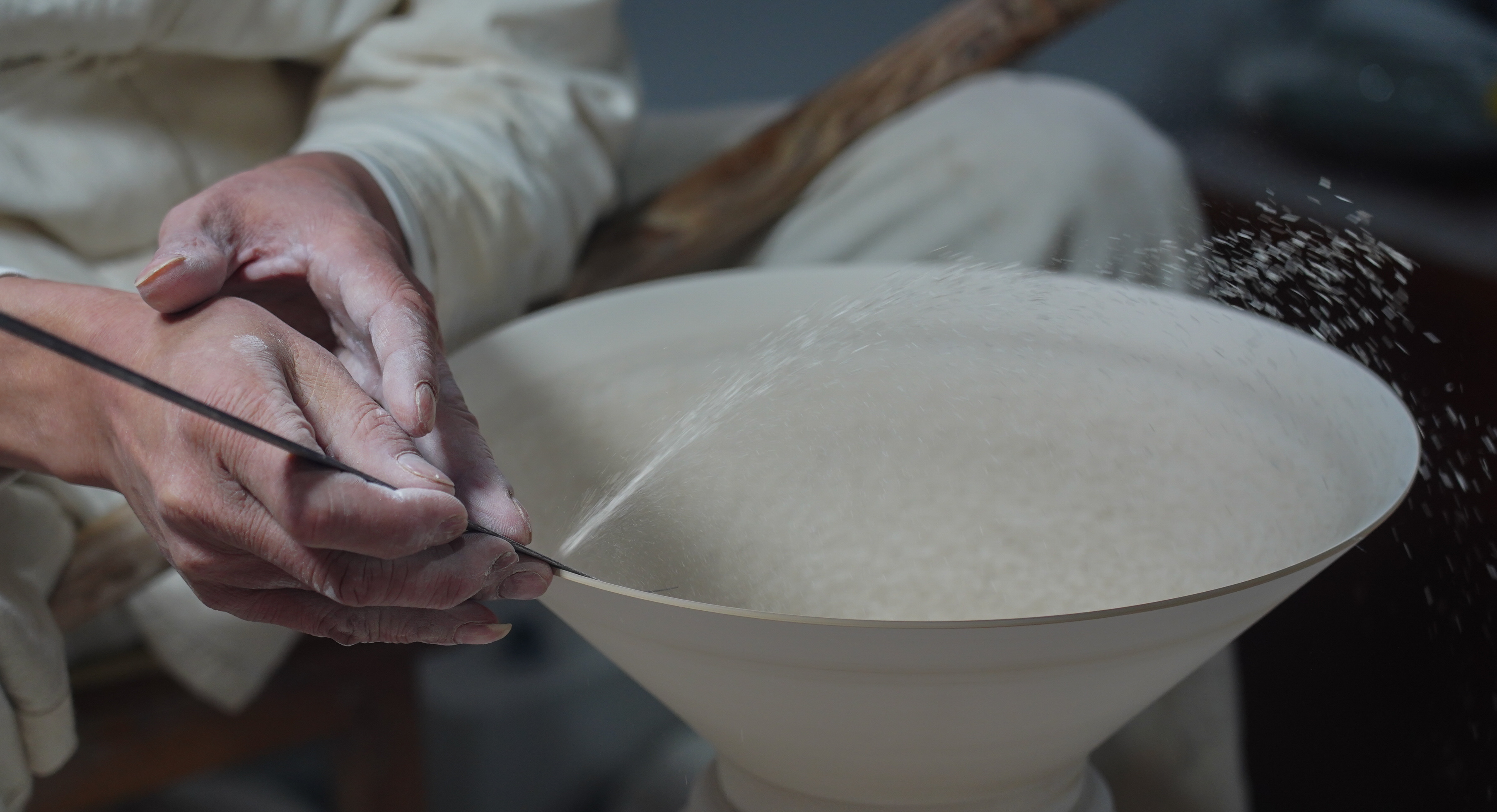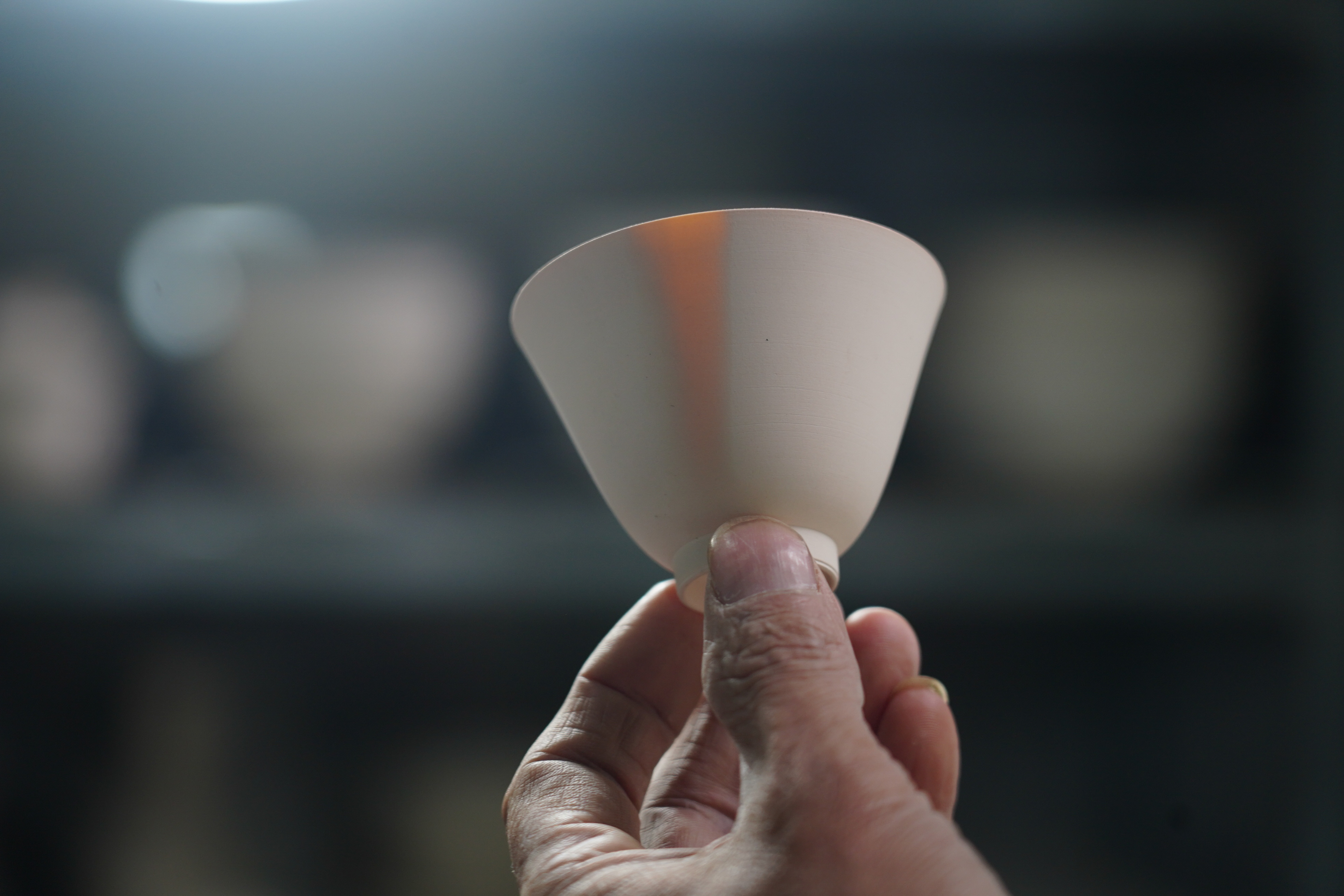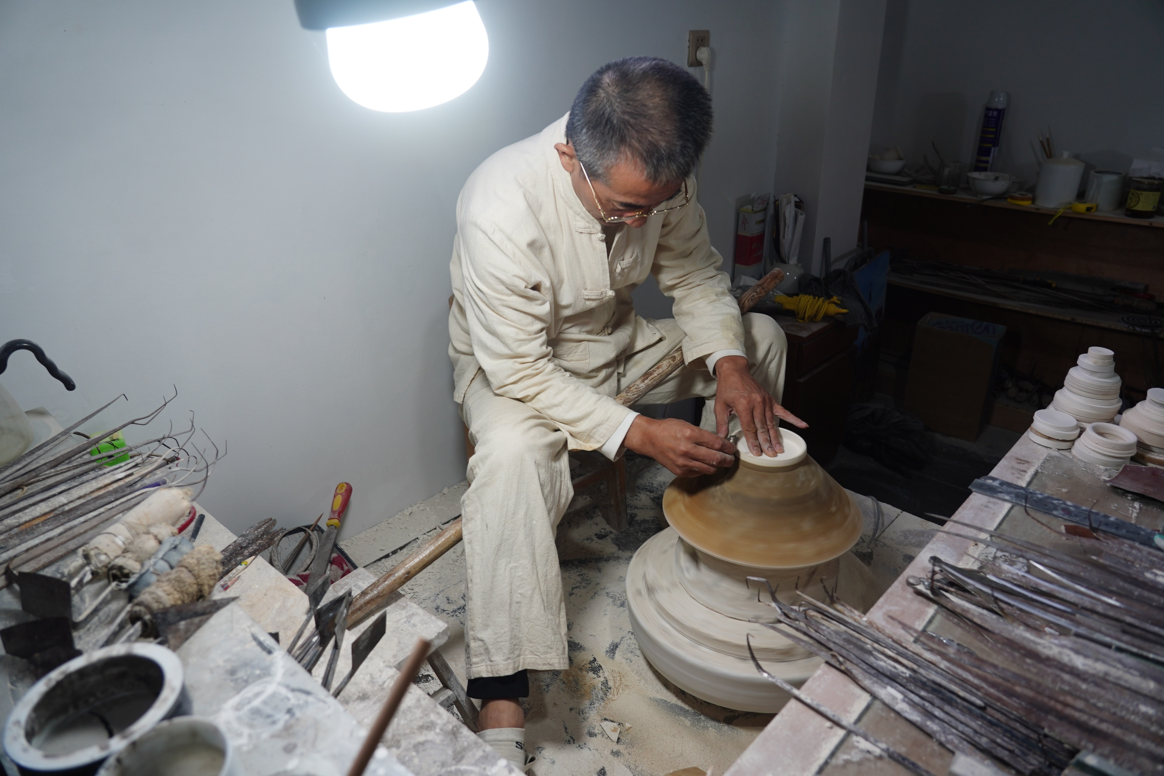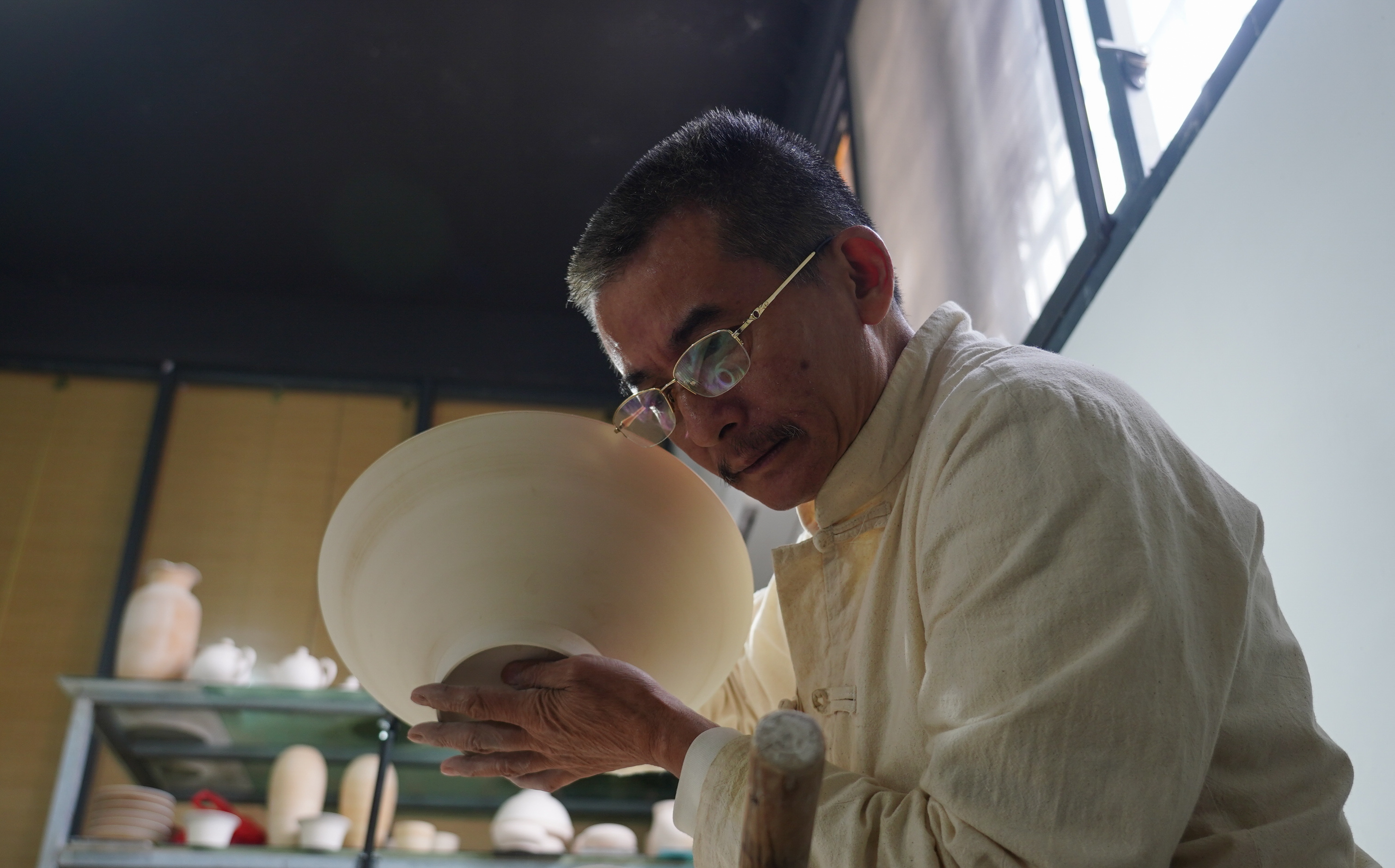 Working in the field for 47 years, he insists for perfection in the making procedures. The shaping of the unburnt porcelain is the essence of the craft, during which craftsman will use tools to peel the unburnt porcelain until it can be penetrated by the light. Xiong's skill has allowed him to make thin body porcelain with a thickness of about 0.15 millimeters.