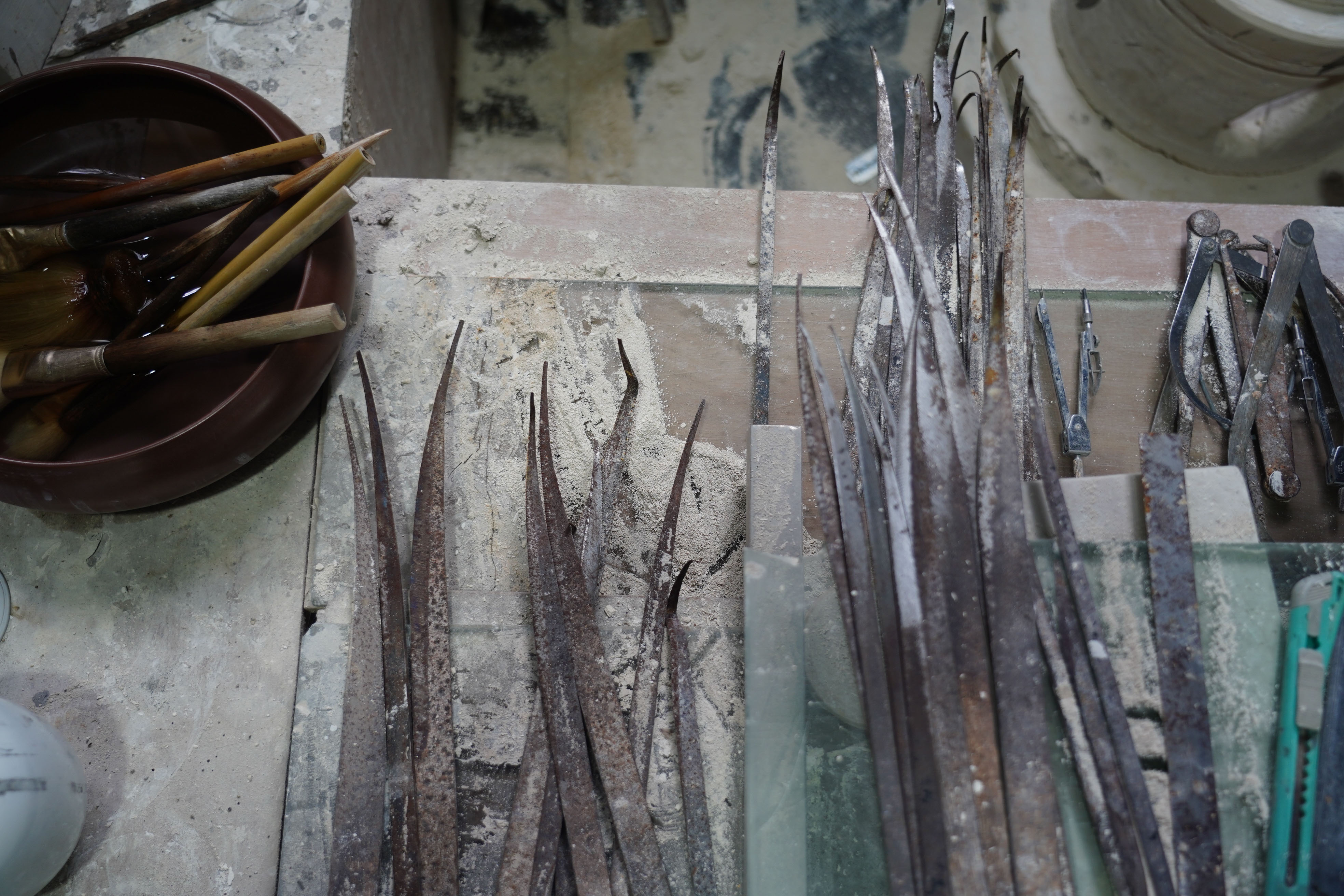 Tools of Xiong Guoan to trim porcelain embryo are seen in Jingdezhen, east China's Jiangxi Province, Oct. 28, 2019. (Xinhua/Zhou Mi)