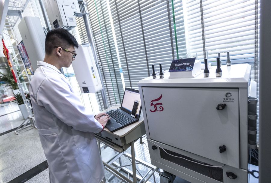 An engineer checks broadband at the trial 5G base station in Wuhan, central China's Hubei Province, Feb. 5, 2018. (Xinhua/Xiong Qi)