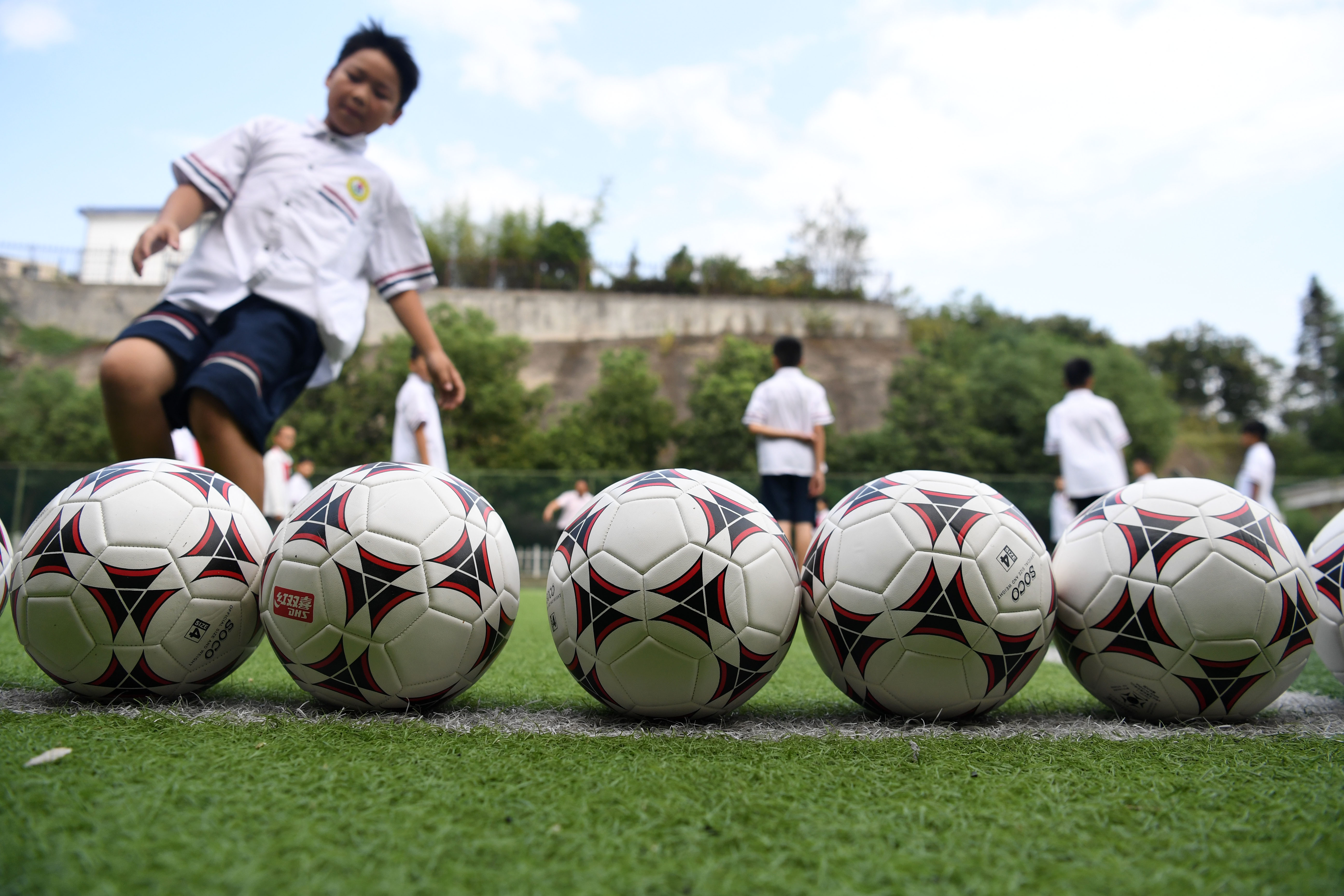Pupils have football class at the Jinzhai County primary school in Jinzhai, east China's Anhui Province, Sept. 3, 2019. (Xinhua/Zhang Duan)