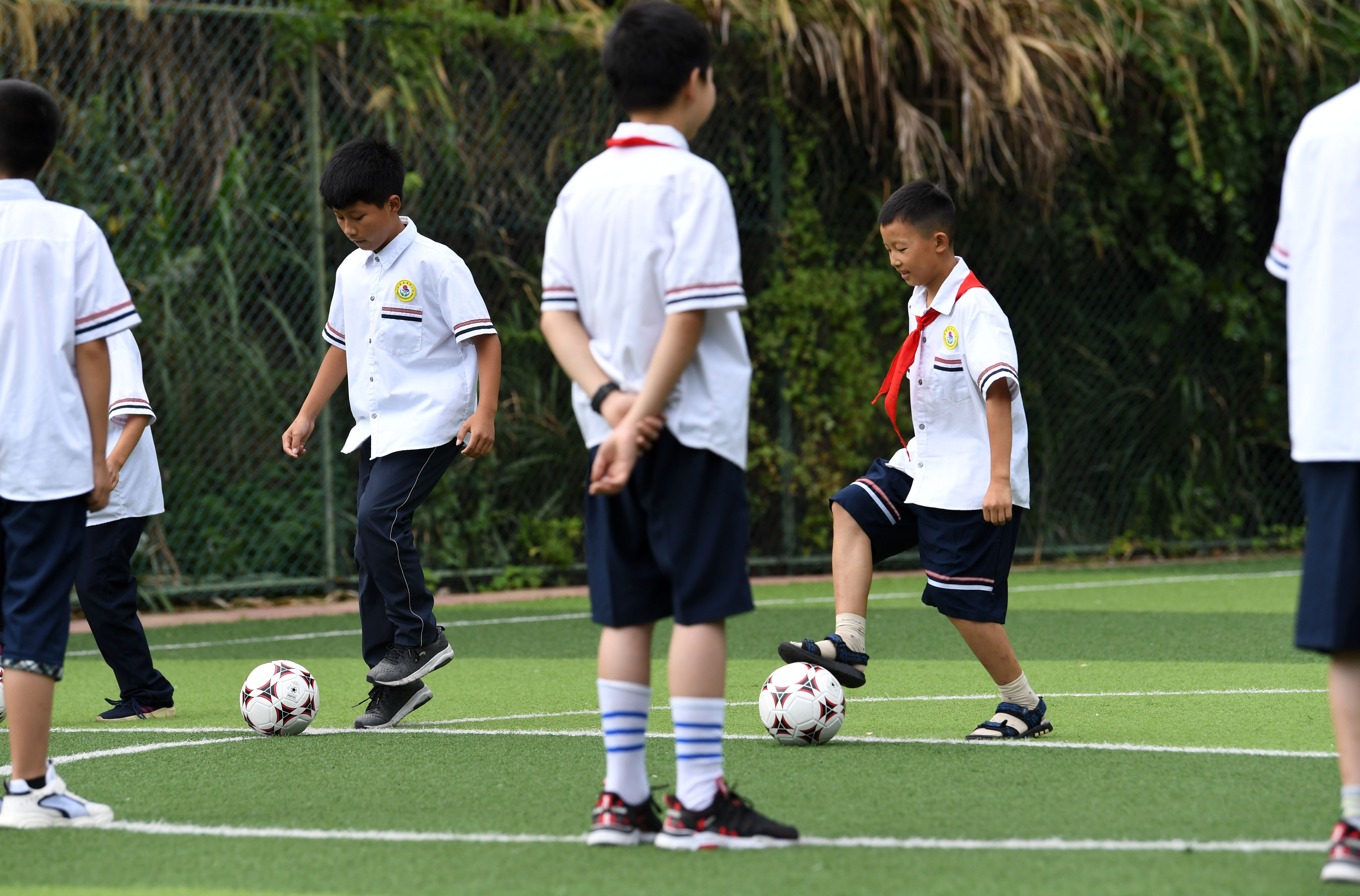 Pupils have football class at the Jinzhai County primary school in Jinzhai, east China's Anhui Province, Sept. 3, 2019. (Xinhua/Liu Junxi)