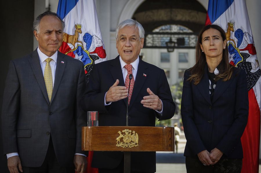 Chilean President Sebastian Pinera (C) makes an announcement at the La Moneda Presidential Palace in Santiago, Chile, on Oct. 30, 2019. (Sebastian Beltran Gaete/Agencia Uno via Xinhua)