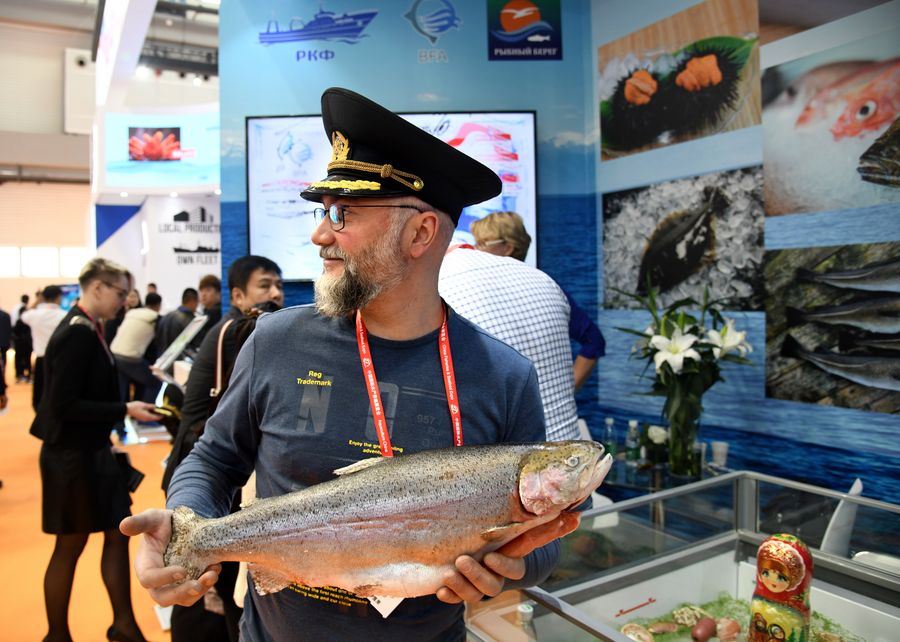 A participant shows a deep-sea fish at the 24th China Fisheries and Seafood Expo (CFSE) in Qingdao, east China's Shandong Province, Oct. 30, 2019. Founded in 1996, the CFSE is held annually and is one of the world's largest fishery expos. (Xinhua/Li Ziheng)