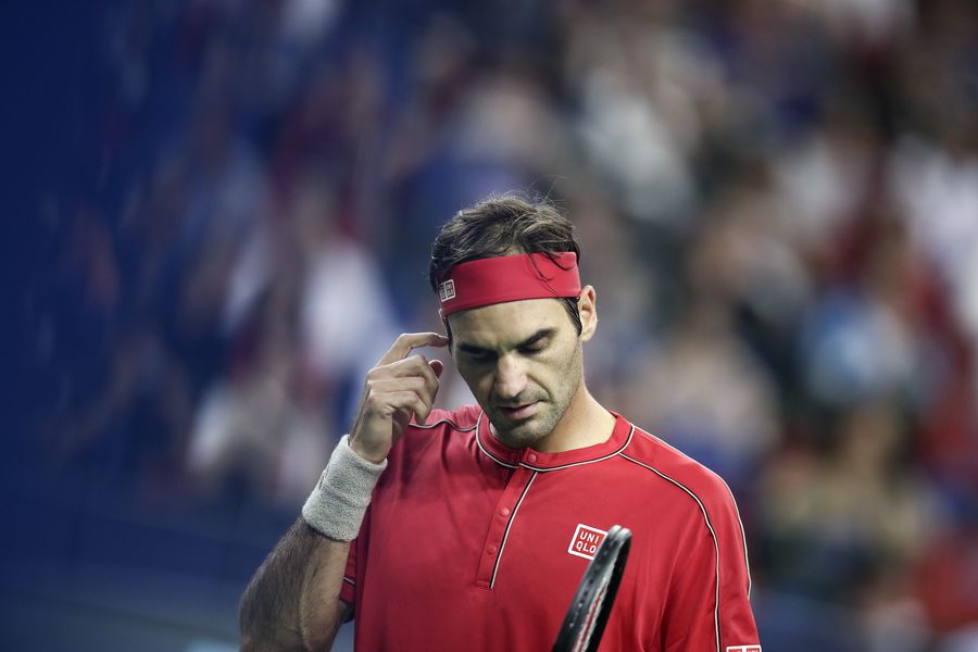 Roger Federer of Switzerland reacts during the men's singles quarterfinal match against Alexander Zverev of Germany at the 2019 ATP Shanghai Masters on Oct. 11, 2019. (Xinhua/Wu Gang)