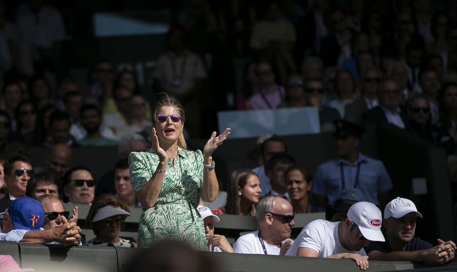 Mirka Federer, wife of Roger Federer, watches the men's singles semifinal match that Roger beats Rafael Nadal of Spain 3-1 at the 2019 Wimbledon Tennis Championships in London on July 12, 2019. (Xinhua/Han Yan)