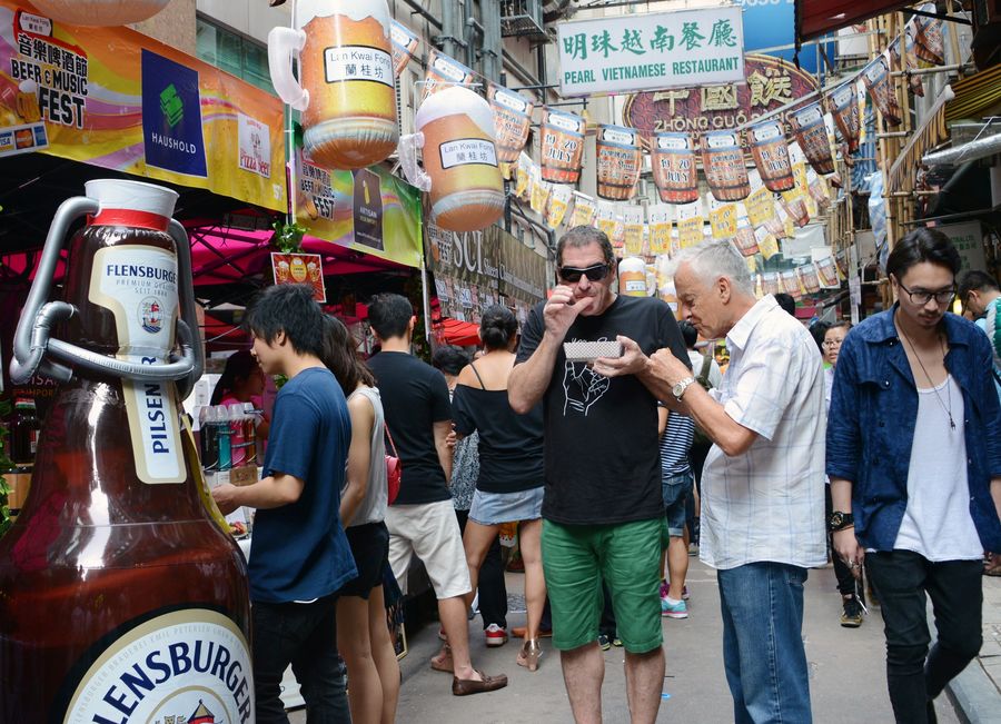 People enjoy food at a music and beer festival at Lan Kwai Fong in Hong Kong, south China, July 19, 2014. (Xinhua/Liu Yun)