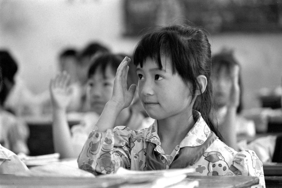 File photo released by Xinhua on July 10, 1992 shows students raising their hands to answer teacher's question at class in Jinggangshan City, east China's Jiangxi Province. (Xinhua/Zha Chunming)