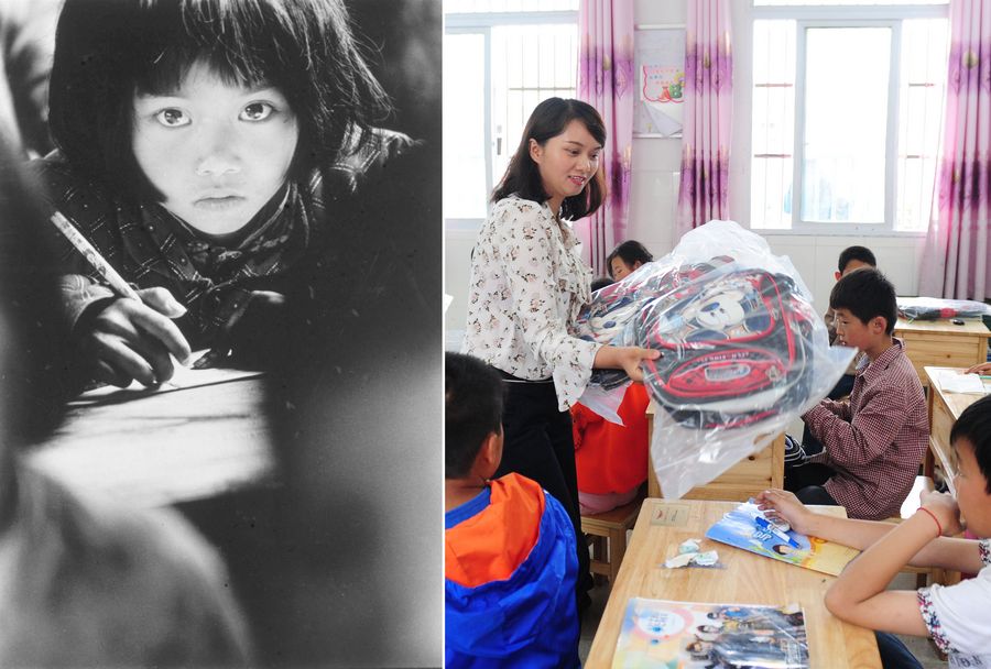 Combo photo shows Su Mingjuan at class in this promotional photo of Hope Project (L, file photo by Xie Hailong) and Su giving gifts to students in Jinzhai Sanhe experimental school, her alma mater in Jinzhai, east China's Anhui Province, May 29, 2019 (R, photo by Wong Congqi). Su Mingjuan, from the hinterland of the Dabie Mountains, became a symbol of Project Hope when this innocent photo of her(photo in the left) moved the country in the 1990s.