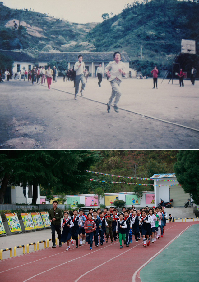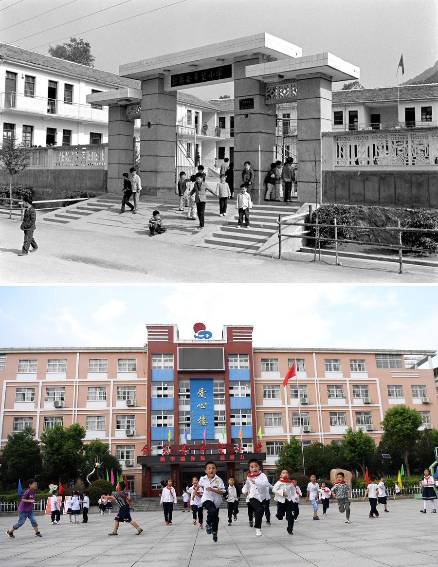 Combo photo shows Jinzhai County primary school in June, 1991 (top, file photo by Zhang Shuguang) and pupils having a break at the Jinzhai County primary school in Jinzhai, east China's Anhui Province, Sept. 3, 2019 (bottom, photo by Liu Junxi). As the first primary school built under the Project Hope in China, Jinzhai County primary school was founded on May 19, 1990. (Xinhua)