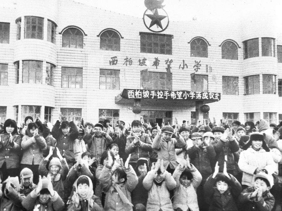 People celebrate during the launching ceremony of "hands in hands" Hope Primary School, which was built with children's donation nationwide by using their lunar new year gift money, in Xibaipo Village of Pingshan County, north China's Hebei Province, Dec. 24, 1993. (Photo by Zhang Zhigang/Xinhua)