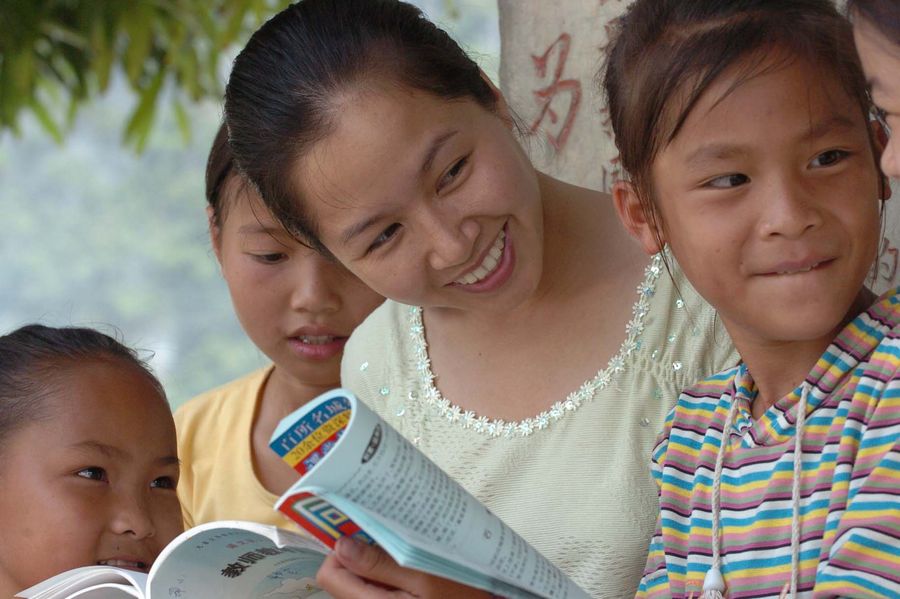 File photo taken on July 29, 2004 shows Zhou Biaoliang and her students at Hope Primary School of Pingguo county of Baise City, southwest China's Guangxi Zhuang Autonomous Region. Zhou finished her study with the help of Project Hope. After graduation from college, she went back to her primary school to be a teacher as return. (Xinhua/Chen Ruihua)