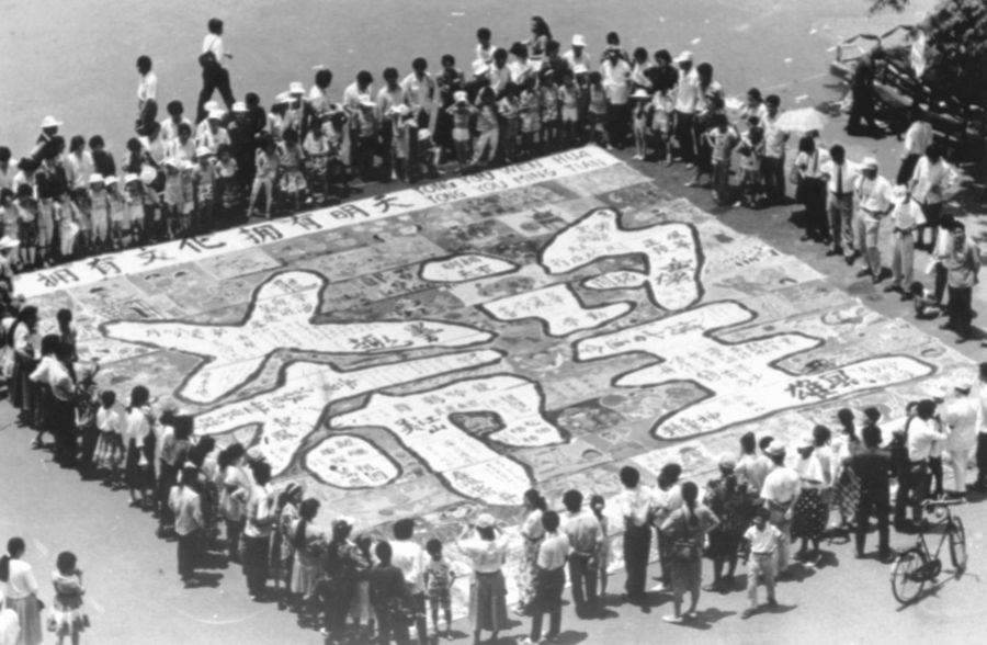 A giant painting presenting the Chinese characters Project Hope is displayed in Changsha, capital of central China's Hunan Province, in this file photo taken on June 1. 1992. (Xinhua/Chen Xiaoying)