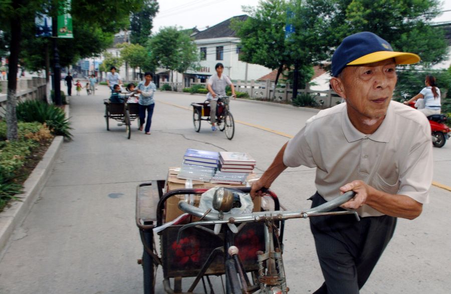 Zhou Huosheng, a 73-year-old retired teacher, sells books with a tricycle in Qiandeng Town of Kunshan City, east China's Jiangsu Province, Sept. 7, 2006. Zhou Huosheng has used his savings and income raised by selling books to help children in poverty-stricken area access education in Jinzhai County of east China's Anhui Province since 1994. (Xinhua/Wang Lei)