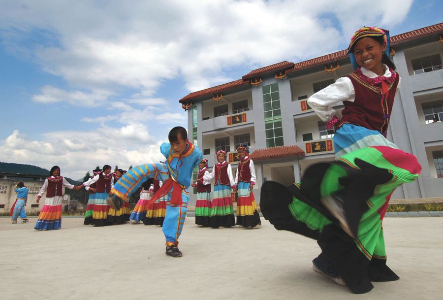 Students of Yi ethnic group dance at a local Hope Primary School in Mianning County, southwest China's Sichuan Province, June 20, 2006. (Xinhua/Ren Yong)