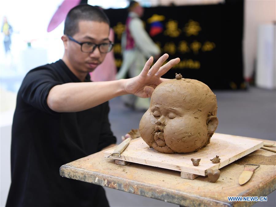 An artist makes clay sculpture at the four-day-long 12th Cross-strait (Xiamen) Cultural Industries Fair in Xiamen, southeast China's Fujian Province, Nov. 1, 2019. (Xinhua/Jiang Kehong)