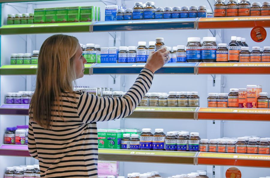 A worker of Blackmores picks products at a supermarket of the company's on Aug. 29, 2019. (Xinhua/Bai Xuefei)