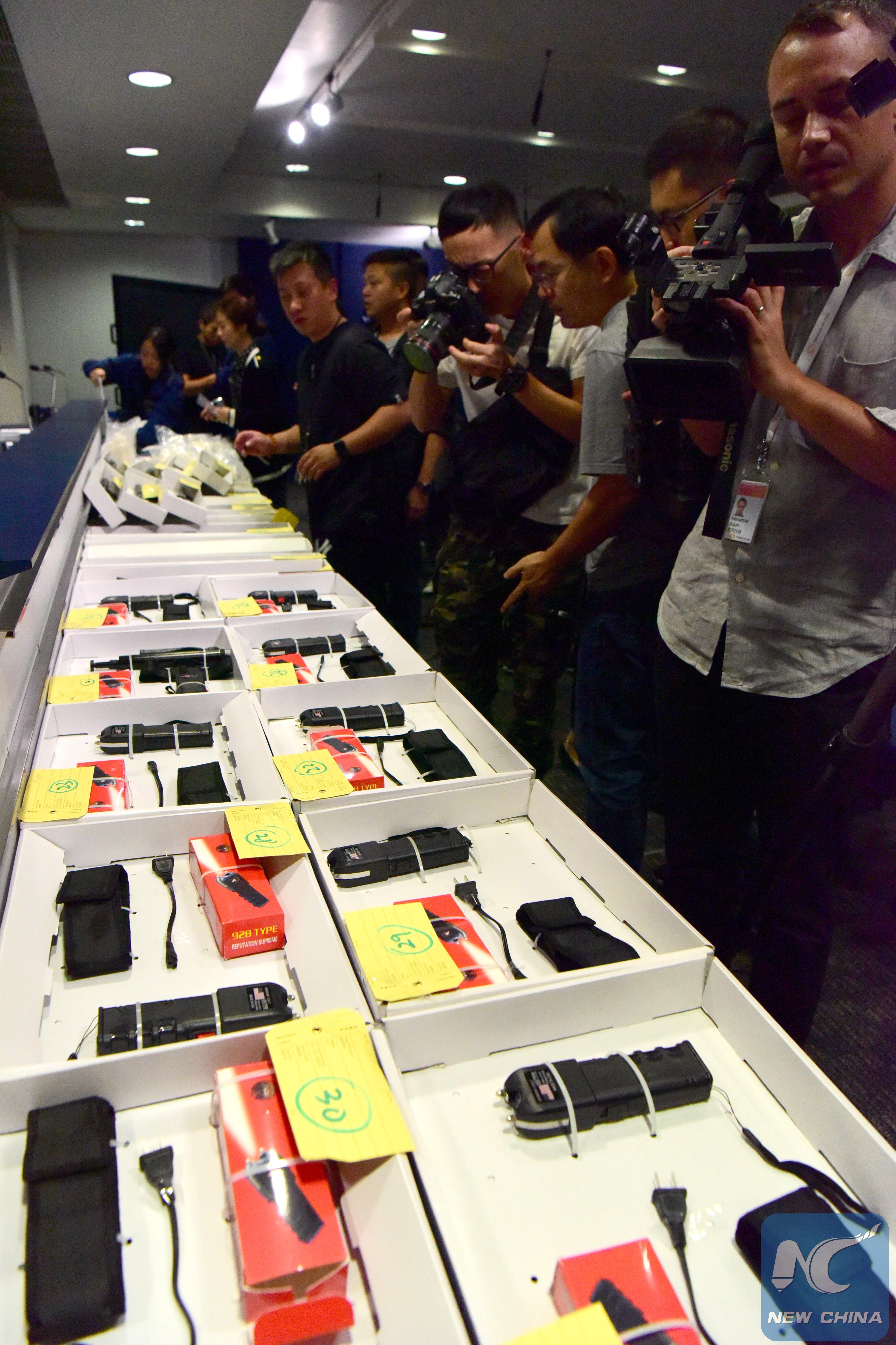 Seized evidences are displayed during a press conference held by Hong Kong police in south China's Hong Kong, Nov. 1, 2019. The Hong Kong police on Friday warned against the escalating violence used by rioters, including dangerous and prohibited weapons such as stun guns and home-made mechanical bombs. (Xinhua/Zhu Xiang)