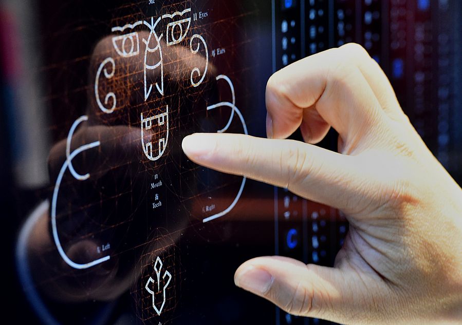 A professor with the Academy of Arts and Design of Tsinghua University, expounds on his designed oracle bone script via a computer at his studio in Tsinghua University in Beijing, capital of China, Sept. 24, 2019. (Xinhua/Li An)