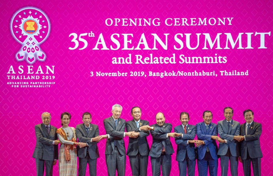 Leaders of ASEAN member states pose for photos at the opening ceremony of the 35th ASEAN Summit and related summits in Bangkok, Thailand, Nov. 3, 2019. (Xinhua/Zhu Wei)