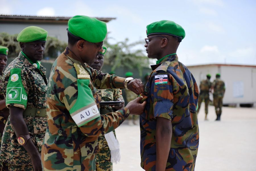 Tigabu Yilma (L, front), African Union Mission in Somalia (AMISOM) Force Commander pins a medal on a Kenyan AMISOM military officer during a medal award ceremony in Mogadishu, capital of Somalia Sept. 29, 2019. (Xinhua/AMISOM)